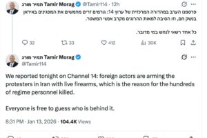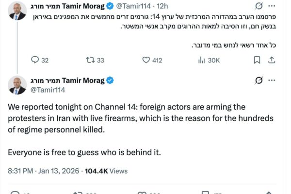 Δηλώνουν και δημόσια στο Ισραήλ την ανάμειξή τους στα γεγονότα στο Ιράν. Όπως αναφέρει δημοσιογράφος του Channel 14 (φίλα προσκείμενο στον Νετανιάχου): Αναφέραμε απόψε στο Channel 14:Ξένοι παράγοντες εξοπλίζουν τους διαδηλωτές στο Ιράν με πραγματικά πυροβόλα όπλα, γεγονός που αποτελεί τον λόγο για τους εκατοντάδες νεκρούς από τις δυνάμεις του καθεστώτος. Ο καθένας είναι ελεύθερος…