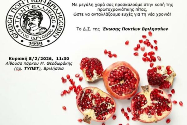 Κόβει την πίτα της η Ένωση Ποντίων Βριλησσίων και καλεί τα μέλη και τους φίλους της στην εκδήλωση που θα πραγματοποιηθεί την Κυριακή 8 Φεβρουαρίου 2026 και ώρα 11:30′ π.μ., στο Πάρκο Μίκης Θεοδωράκης – Πρώην ΤΥΠΕΤ (Αίθουσα “Νίκος Εγγονόπουλος” Π.Μπακογιάννη 38, Βριλήσσια). Αναλυτικά, η ανακοίνωση – πρόσκληση της Ένωσης Ποντίων Βριλησσίων “Οι Τραντέλληνες” έχει ως…