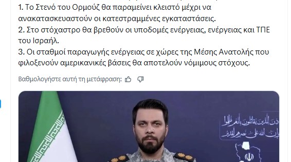 Τραμπ: Αν δεν ανοίξετε σε 48 τα στενά του Ορμούζ θα σας καταστρέψουμε όλες τις ενεργειακές υποδομές Ιράν: Αν χτυπήσετε μια υποδομή όλες οι ενεργειακές υποδομές, τα συστήματα πληροφορικής και οι εγκαταστάσεις αφαλάτωσης που ανήκουν στις Ηνωμένες Πολιτείες και το “καθεστώς” (Ισραήλ) στην περιοχή θα γίνουν στόχος Δεν μασάνε οι Ιρανοί από τις απειλές Τραμπ…