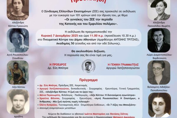 Δυο γυναίκες από τη Μεταμόρφωση στις τιμώμενες: Λίζα και Αλεξάνδρα Κόττου Κυριακή, 7 Δεκεμβρίου 2025, ώρα 11:00 πμ Πνευματικό Κέντρο Δήμου Αθήνας Εκδήλωση του Συνδέσμου Ελληνίδων Επιστημόνων (ΣΕΕ), με αφορμή τα 101 χρόνια από την ίδρυση του Πρόγραμμα Δρ. Εύη Μπάτρα, Πρόεδρος ΣΕΕ – Χαιρετισμός Αργυρώ Χατζηπαναγιώτου, Εκπαιδευτικός – Συγγραφέας – Ερευνήτρια, Γενική Γραμματέας ΣΕΕ,«Αλεξάνδρα Κόπτου:…