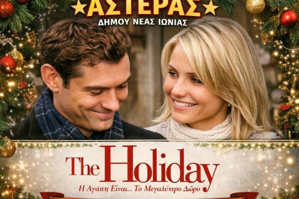 Η ταινία The Holiday προβάλλεται στον Δημοτικό Κινηματογράφο «Αστέρας» την Τετάρτη 17 Δεκεμβρίου 2025 στις 7 μμ , στο πλαίσιο των χριστουγεννιάτικων εκδηλώσεων του Δήμου Νέας Ιωνίας. Πρόκειται για μια χριστουγεννιάτικη ιστορία, γεμάτη συναίσθημα και χαμόγελα. Είσοδος ελεύθερη