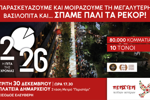 Η μεγαλύτερη Βασιλόπιτα της Ελλάδας θα φτιαχτεί και φέτος στο Περιστέρι, όπως προαναγγέλλει με την ανακοίνωση του γραφείου τύπου ο Δήμος Περιστερίου. Η δράση που φέρει τον ευρηματικό τίτλο “Σπάμε και πάλι όλα τα ρεκόρ – Ένας πεζόδρομος… πίτα!” και πραγματοποιείται σε συνεργασία με την Συντεχνία Αρτοποιών Αθηνών, Προαστίων και Περιχώρων θα λάβει χώρα την…