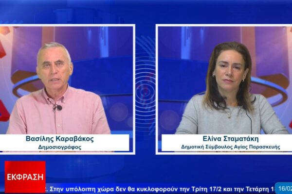 Στο στούντιο της Έκφρασης βρέθηκε η δημοτική σύμβουλος Αγίας Παρασκευής Ελίνα Σταματάκη όπου συζήτησε με το Βασίλη Καραβάκο τα επίκαιρα θέματα της πόλης: – Τα προβλήματα των σχολείων, όπως αναδείχθηκαν από την πρόσφατη συνεδρίαση του δημοτικού συμβουλίου, – το αμαξοστάσιο στην Τρικάλων και τα προβλήματα που υπάρχουν, – ο Νέος Οικοδομικός Κανονισμός και η στάση…