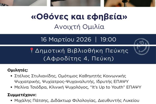 Εκδήλωση με θέμα “Οθόνες και Εφηβεία” πραγματοποιείται στη Δημοτική Βιβλιοθήκη Πεύκης. Η εκδήλωση που γίνεται σε συνεργασία της Κοινωνικής Υπηρεσίας του Δήμου Λυκόβρυσης-Πεύκης με με τον φορέα ψυχικής υγείας ΕΠΑΨΥ, θα λάβει χώρα τη Δευτέρα 16 Μαρτίου 2026 και ώρα 7.00′ μ.μ., στη Δημοτική Βιβλιοθήκη Πεύκης (Αφροδίτης 4). Αναλυτικά, η ανακοίνωση του γραφείου τύπου του Δήμου Λυκόβρυσης…