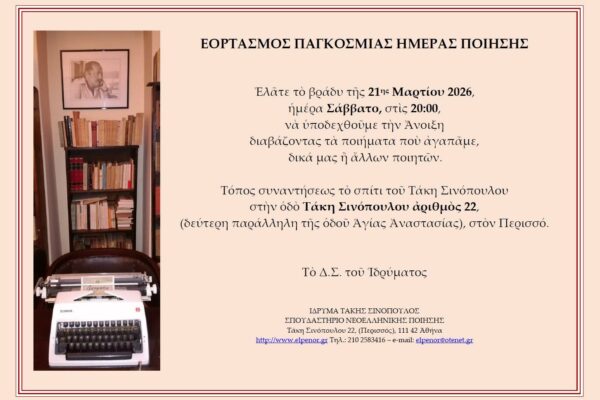 Με ποιητική βραδιά τιμούν την Παγκόσμια Ημέρα Ποίησης και τον ερχομό της Άνοιξης στο Ίδρυμα Τάκης Σινόπουλος. Η εκδήλωση θα λάβει χώρα το Σάββατο, 21 Μαρτίου 2026 και ώρα 8.00′ μ.μ., στο κτήριο του Ιδρύματος (οδός Τάκη Σινόπουλου 22, Περισσός). Αναλυτικά, η ανακοίνωση του Ιδρύματος Τάκης Σινόπουλος έχει ως εξής: Ελάτε το βράδυ της 21ης Μαρτίου 2026,…