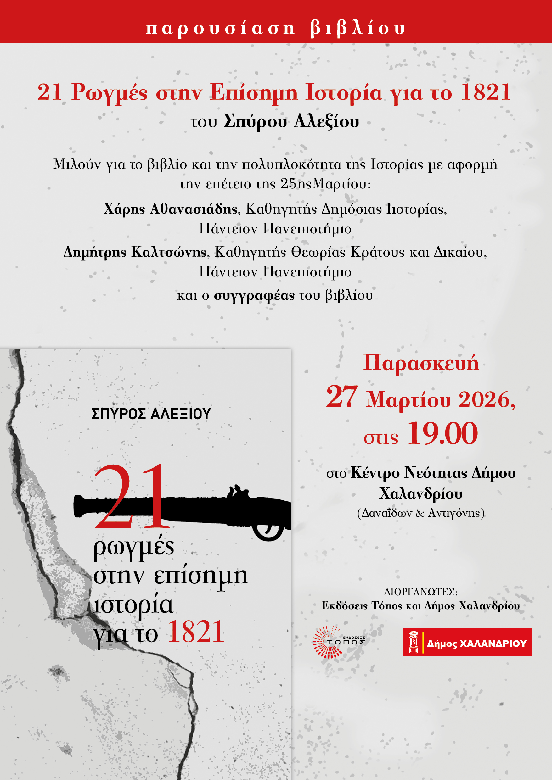 Ο Δήμος Χαλανδρίου και οι εκδόσεις «Τόπος» διοργανώνουν, με αφορμή την επέτειο της 25ης Μαρτίου, την εκδήλωση «21 Ρωγμές στην Επίσημη Ιστορία για το 1821», την Παρασκευή 27 Μαρτίου 2026, στο Κέντρο Νεότητας του Δήμου (Δαναΐδων και Αντιγόνης), στις 19.00‘, με τη συμμετοχή διακεκριμένων πανεπιστημιακών.