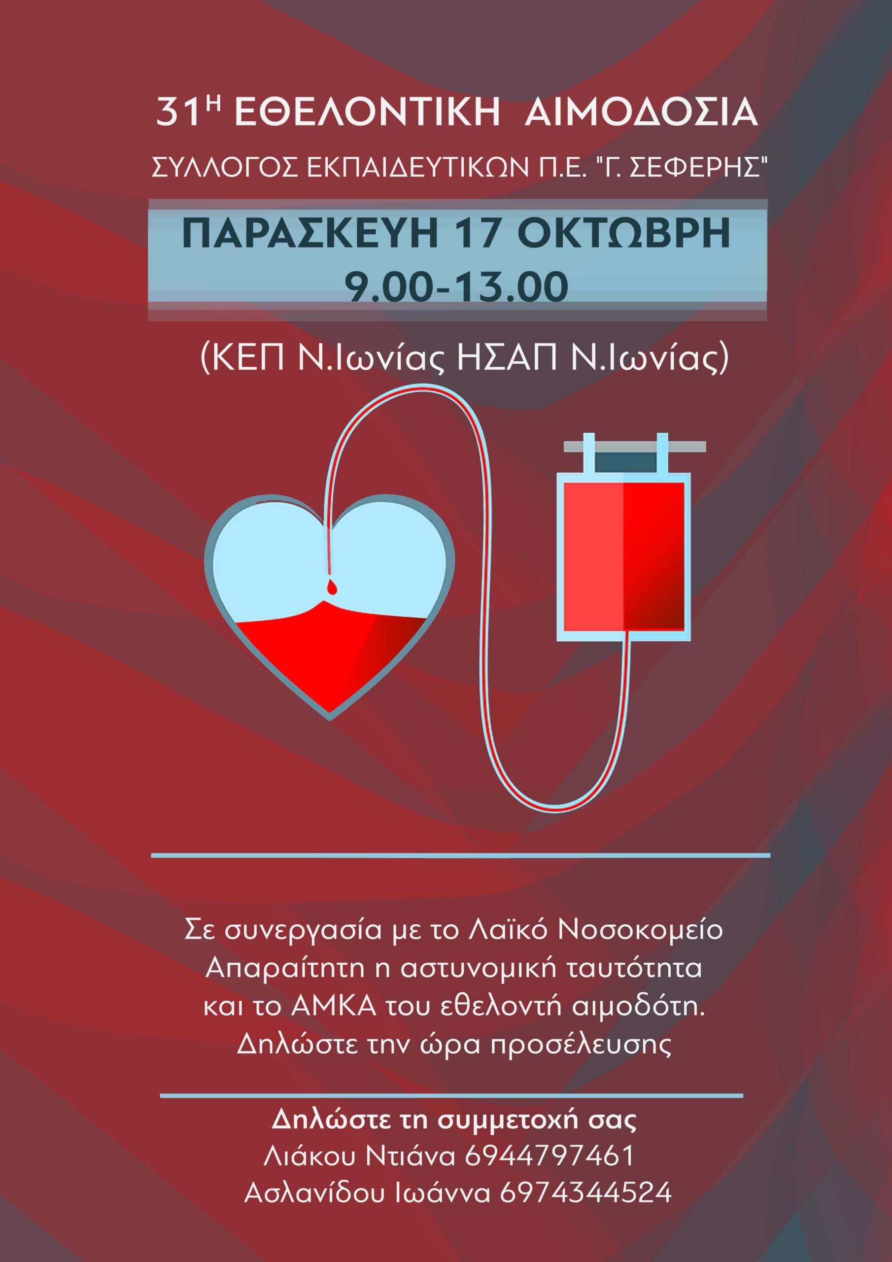 Με την ευκαιρία της 31ης Εθελοντικής Αιμοδοσίας που οργανώνει ο Σύλλογος Γ. ΣΕΦΕΡΗΣ την Παρασκευή 17 Οκτωβρίου 2025 στο ΚΕΠ Ν.ΙΩΝΙΑΣ (πλησίον ΗΣΑΠ Ν. Ιωνίας ) από τις 9.15′ π.μ. μέχρι τις 13.00′ μ.μ.: