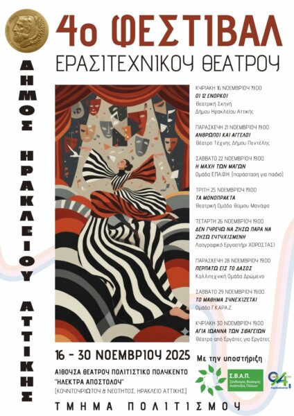 Το 4 ο Φεστιβάλ Ερασιτεχνικού Θεάτρου του Δήμου Ηρακλείου Αττικής έρχεται φέτος από τις 16 έως τις 30 Νοεμβρίου για να παρουσιάσει στο κοινό παραστάσεις από ερασιτεχνικούς θιάσους της Αττικής, στην θεατρική αίθουσα του δημοτικού Πολιτιστικού Πολύκεντρου «Ηλέκτρα Αποστόλου» (Κουντουριώτου και Νεότητος, Ηράκλειο Αττικής, υπόγειο) με ελεύθερη είσοδο για όλες και όλους.