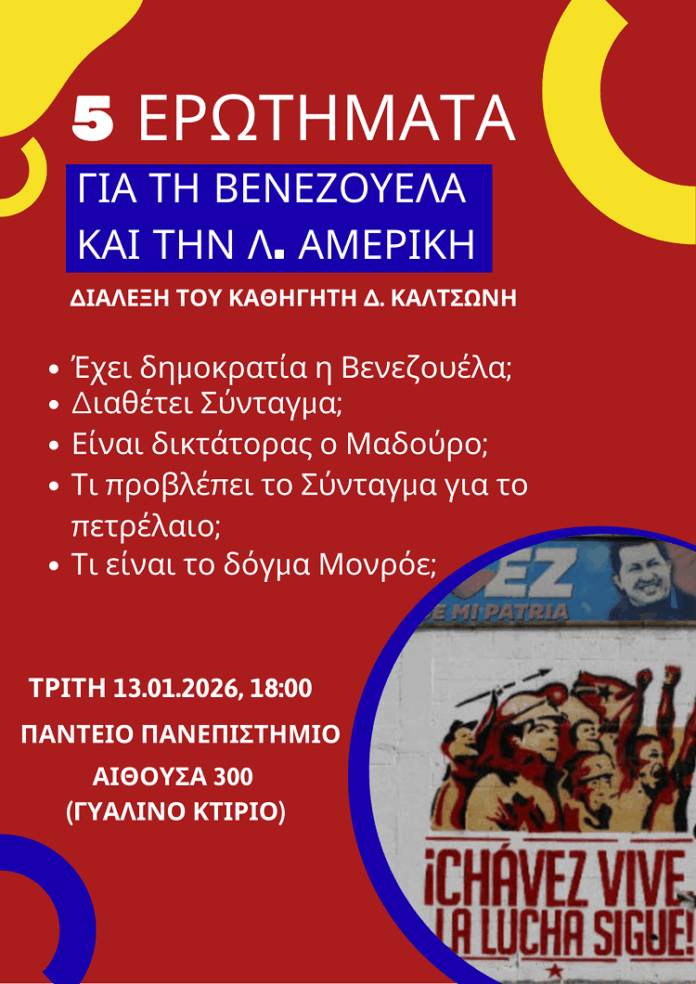 Εκδήλωση με τίτλο “5 ερωτήματα για τη Βενεζουέλα και τη Λ. Αμερική” και κεντρικό ομιλητή τον καθηγητή θεωρίας κράτους και δικαίου, Δ. Καλτσώνη, διοργανώνεται στο Πάντειο Πανεπιστήμιο.