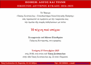 Παρουσιάζεται σήμερα, 15 Οκτωβρίου 2025 και ώρα 7.30′ μ.μ., στο Ίδρυμα “Τάκης Σινόπουλος” η εκδήλωση με τίτλο “Τα καφενεία του Μάνου Ελευθερίου – Η τέχνη