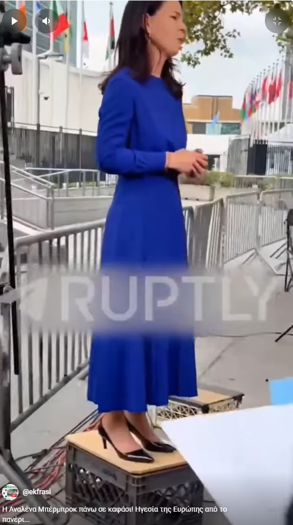 Η πρώην ΥΠ.ΕΞ της Γερμανίας και πρόεδρος της ΓΣ του ΟΗΕ Αναλένα Μπέρμπροκ ανέβηκε σε καφάσι ώστε να φαίνεται ψηλότερη, σε δηλώσεις σε τηλεοπτικούς σταθμούς!
