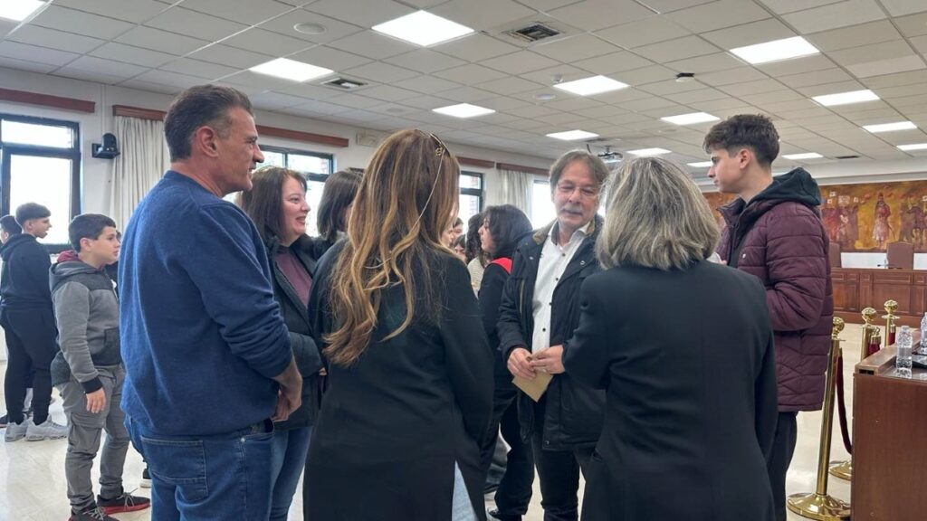 Το πρωί της Τρίτης, ο Δήμαρχος της πόλης Χρήστος Βρεττάκος με την αντιδήμαρχο παιδείας και πολιτισμού, υποδέχτηκαν στην αίθουσα του Δημοτικού Συμβουλίου τους μαθητές των δύο σχολείων με τους συνοδούς καθηγητές τους.