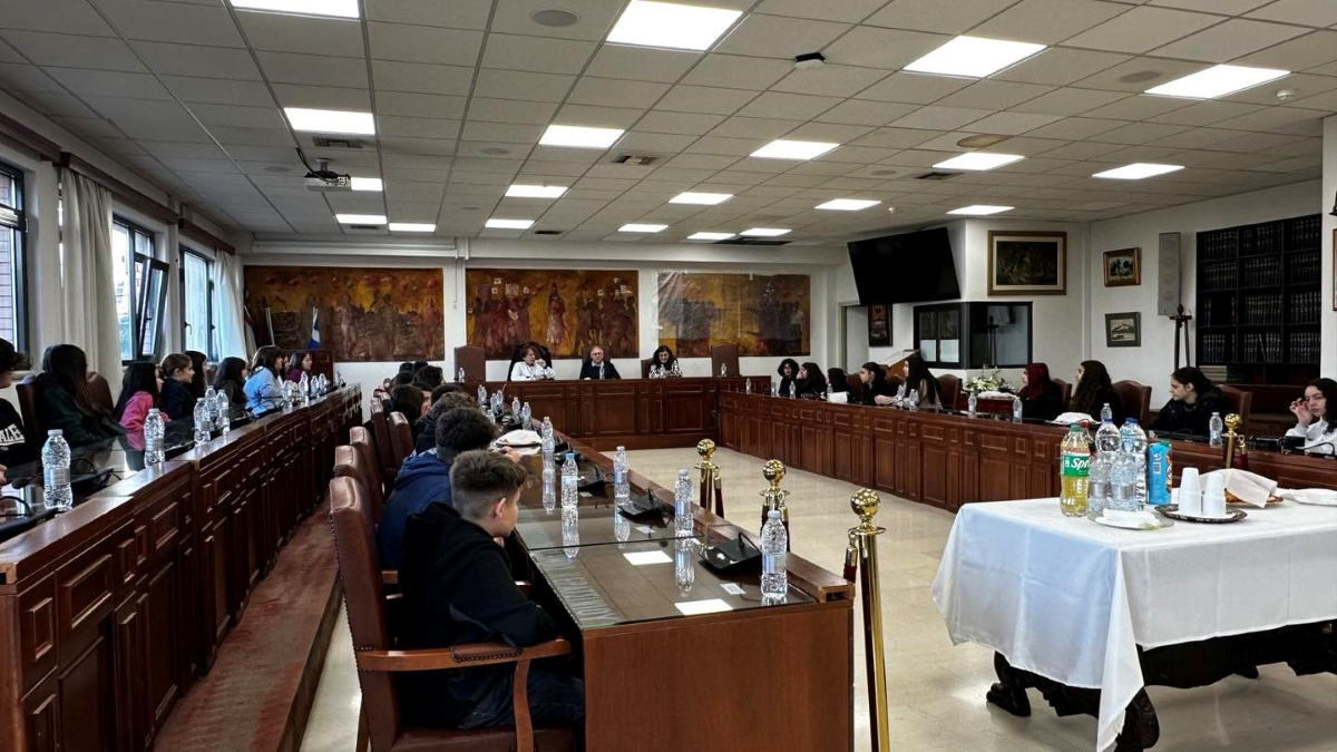 Το πρωί της Τρίτης, ο Δήμαρχος της πόλης Χρήστος Βρεττάκος με την αντιδήμαρχο παιδείας και πολιτισμού, υποδέχτηκαν στην αίθουσα του Δημοτικού Συμβουλίου τους μαθητές των δύο σχολείων με τους συνοδούς καθηγητές τους.