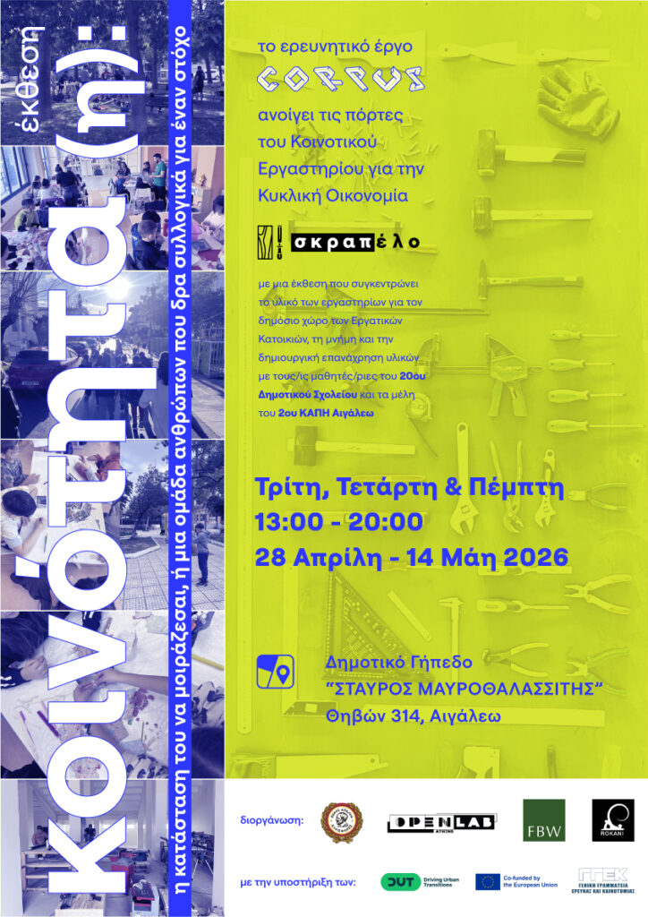 Το Κοινοτικό Εργαστήριο «Σκραπέλο» αποτελεί αποτέλεσμα της συνεργασίας του Δήμου Αιγάλεω, του Ανοικτού Εργαστηρίου Αθήνας (Open Lab Athens), του αρχιτεκτονικού γραφείου FBW και της ΚΟΙΝΣΕΠ «Ροκάνι», στο πλαίσιο του ερευνητικού έργου CORPUS.