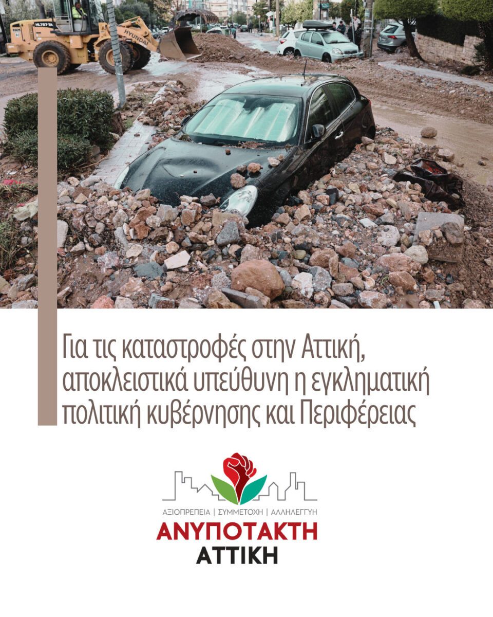 Η εγκληματική πολιτική κυβέρνησης και Περιφέρειας είναι αποκλειστικά υπεύθυνη για τις καταστροφές στην Αττική από την πρόσφατη κακοκαιρία και τα επαναλαμβανόμενα πλημμυρικά φαινόμενα, καταγγέλλει με ανακοίνωση της η Ανυπότακτη Αττική. “Είναι πλέον φανερό σε όλους ότι η ενίσχυση της πολιτικής προστασίας, των υποδομών και της αντιπλημμυρικής και αντιπυρικής θωράκισης της Αττικής είναι κάτι παραπάνω από επιτακτική”, τονίζει η Περιφερειακή Παράταξη.