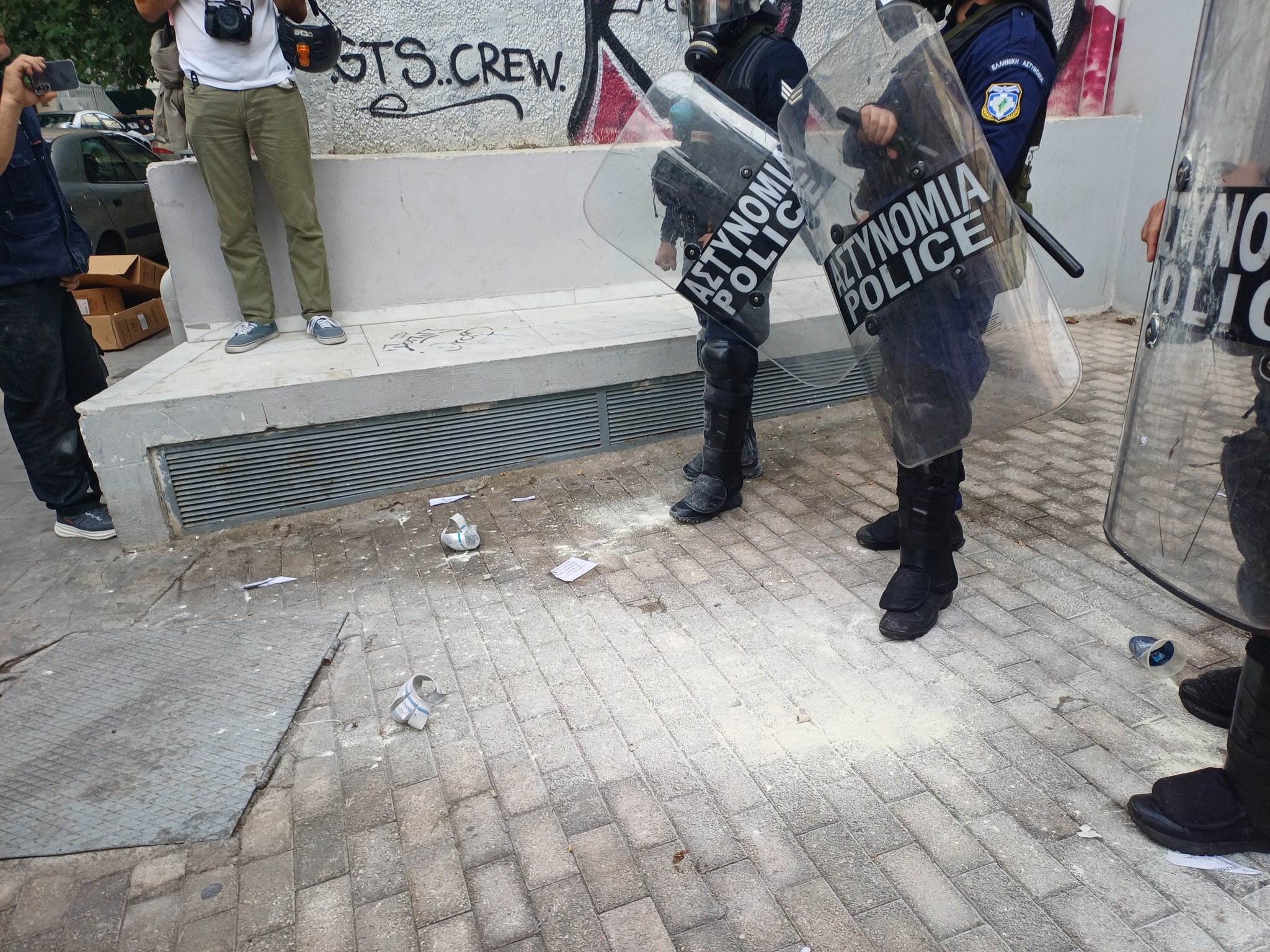 Απίστευτες σκηνές αστυνομικής βίας καταγράφηκαν πριν από λίγη ώρα σήμερα (23/10) έξω από Διεύθυνση Πρωτοβάθμιας Εκπαίδευσης στο Μεταξουργείο, με την ΕΛ.ΑΣ. να πνίγει στα χημικά τους συγκεντρωμένους, μεταξύ των οποίων και παιδιά Δημοτικού. Όπως καταγγέλλουν οι εκπαιδευτικοί και φαίνεται σε βίντεο οι δυνάμεις καταστολής χτύπησαν με γκλομπς εκπαιδευτικούς και γονείς ενώ δεν δίστασαν να σπρώξουν με ασπίδες και έγκυο δασκάλα!