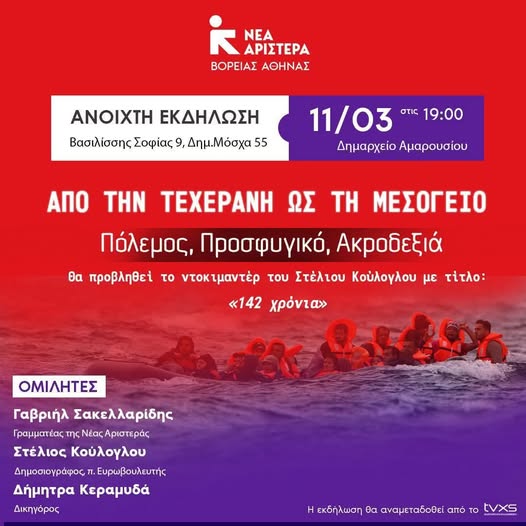 Η οργάνωση της Νέας Αριστεράς Βόρειας Αθήνας διοργανώνει ανοιχτή εκδήλωση με θέμα: “Από την Τεχεράνη ως τη Μεσόγειο – Πόλεμος, Προσφυγικό και Ακροδεξιά”. Η εκδήλωση θα πραγματοποιηθεί την Τετάρτη, 11 Μαρτίου 2026, στις 7.00′ μ.μ., στο Δημαρχείο Αμαρουσίου (Δημ. Μόσχα 55).