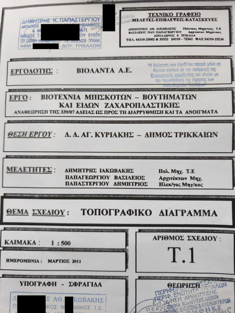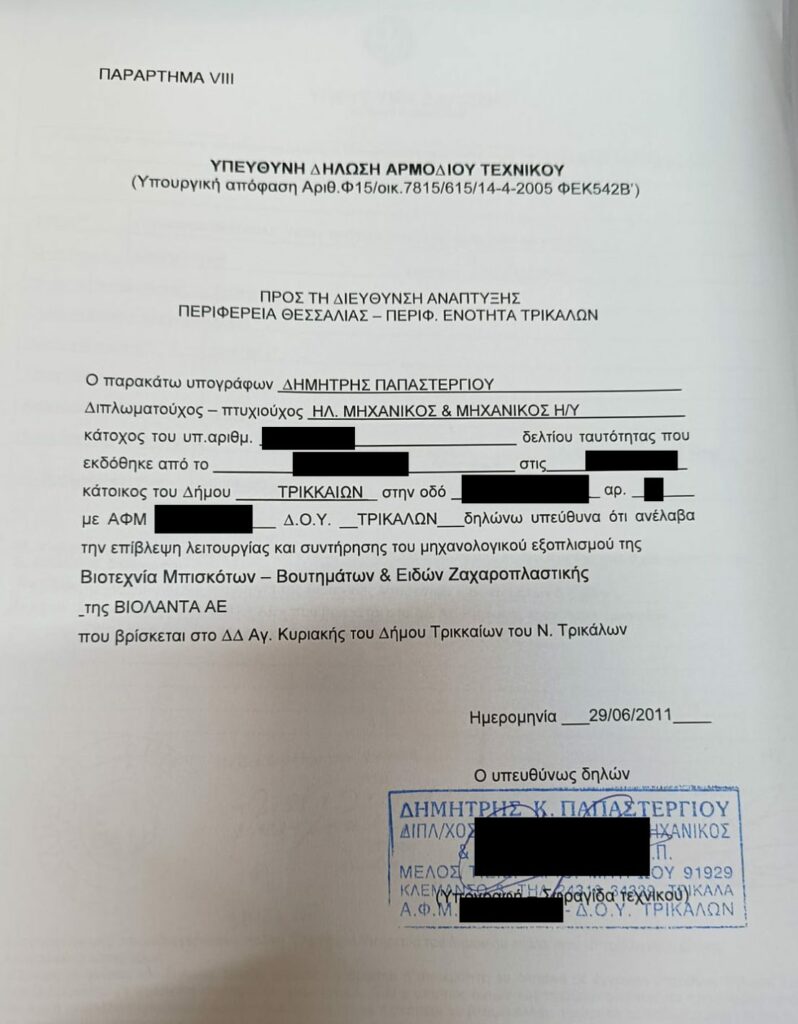 Όπως αποκαλύπτει το Documento, ο Δ. Παπαστεργίου ως ηλεκτρολόγος μηχανικός, υπέγραψε και τέσσερα χρόνια αργότερα την μελέτη που υποβλήθηκε το 2011 στην Περιφέρεια Θεσσαλίας, επί Κώστα Αγοραστού, για να πάρει άδεια λειτουργίας η επίμαχη μονάδα, στην οποία τα ξημερώματα της Δευτέρας θρηνήσαμε θύματα.