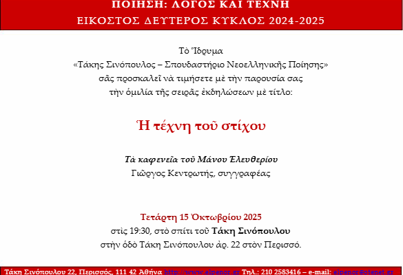 Παρουσιάζεται σήμερα, 15 Οκτωβρίου 2025 και ώρα 7.30′ μ.μ., στο Ίδρυμα “Τάκης Σινόπουλος” η εκδήλωση με τίτλο “Τα καφενεία του Μάνου Ελευθερίου – Η τέχνη του στίχου”, σε παρουσίαση του συγγραφέα Γιώργου Κεντρωτή. Η εκδήλωση εντάσσεται στη σειρά εκδηλώσεων “Ποίηση: Λόγος και Τέχνη” που αισίως μπαίνει στον 22ο κύκλο της για την περίοδο 2024 –…