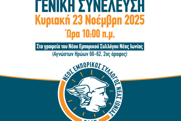Γενική Συνέλευση και εκλογές διοργανώνονται στον Νέο Εμπορικό Σύλλογο Ν. Ιωνίας. Η Γενική Συνέλευση έχει προγραμματιστεί για την Κυριακή 23 Νοέμβρη 2025 και ώρα 10:00′ π.μ., στα γραφεία του Νέου Εμπορικού Συλλόγου Νέας Ιωνίας (Αγνώστων Ηρώων 60-62, 2ος όροφος), ενώ μετά το πέρας της Συνέλευσης θα πραγματοποιηθούν οι εκλογές για την ανάδειξη του Δ.Σ., διαδικασία…