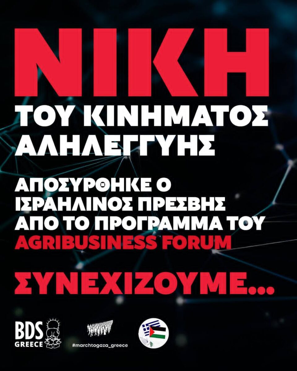 Μια σημαντική πρώτη νίκη σημειώθηκε μετά την πίεση που ασκήθηκε τις τελευταίες ημέρες από συλλογικότητες, ακαδημαϊκούς, φοιτητές, επαγγελματικούς φορείς και πολίτες ενάντια στην παρουσία επίσημων εκπροσώπων του ισραηλινού κράτους στο AgriBusiness Forum 2026, που θα πραγματοποιηθεί στις 18–19 Μαρτίου στην Αθήνα.