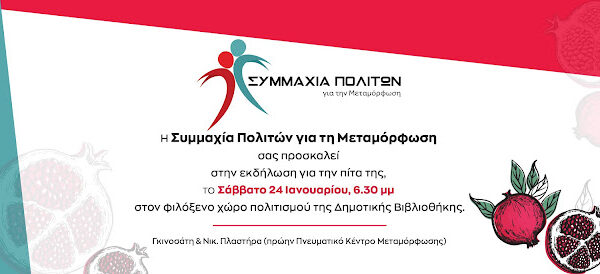 Η Συμμαχία Πολιτών για τη Μεταμόρφωση κόβει την πίτα της και καλεί τα μέλη και τους φίλους της στην εκδήλωση. Η εκδήλωση της κοπής της πίτας της Συμμαχίας Πολιτών θα πραγματοποιηθεί το Σάββατο 24 Ιανουαρίου 2026 και ώρα 6.30′ μ.μ. στη Δημοτική Βιβλιοθήκη (Γκινοσάτη και Πλαστήρα).