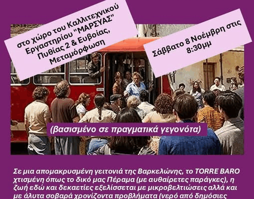Η ισπανική ταινία “το 47” προβάλλεται στο χώρο του Καλλιτεχνικού Εργαστηρίου “ΜΑΡΣΥΑΣ” Πυθίας 2 & Ευβοίας, Μεταμόρφωση Η προβολή γίνεται από την Μικτή Χορωδία “IN TONO” το Σάββατο 8 Νοέμβρη στις 8:30μμ