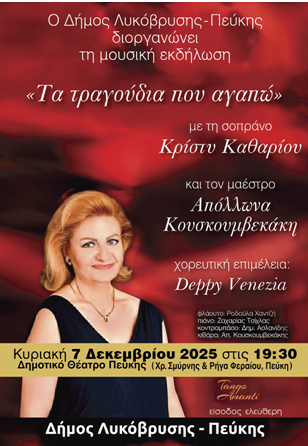 Στη δημοσιότητα το πρόγραμμα των χριστουγεννιάτικων εκδηλώσεων του Δήμου Λυκόβρυσης – Πεύκης για την περίοδο των εορτών.