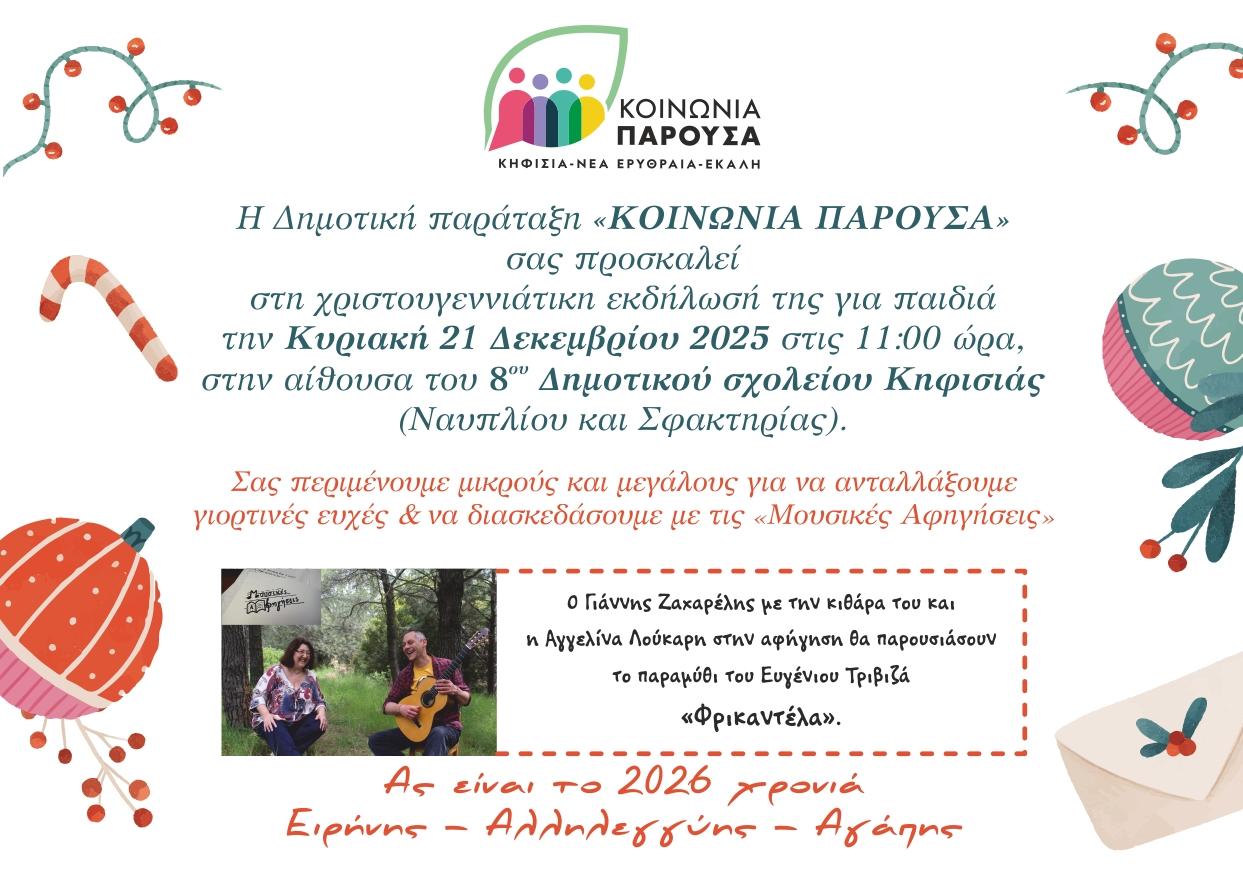 Η δημοτική παράταξη «Κοινωνία Παρούσα», με αφορμή τις εορτές των Χριστουγέννων και της Πρωτοχρονιάς, σας προσκαλεί την Κυριακή 21 Δεκεμβρίου 2025, στις 11.00‘ π.μ., στην χριστουγεννιάτικη της εκδήλωση για τα παιδιά, στην αίθουσα του 8ου Δημοτικού Σχολείου Κηφισιάς (Ναυπλίου και Σφακτηρίας).