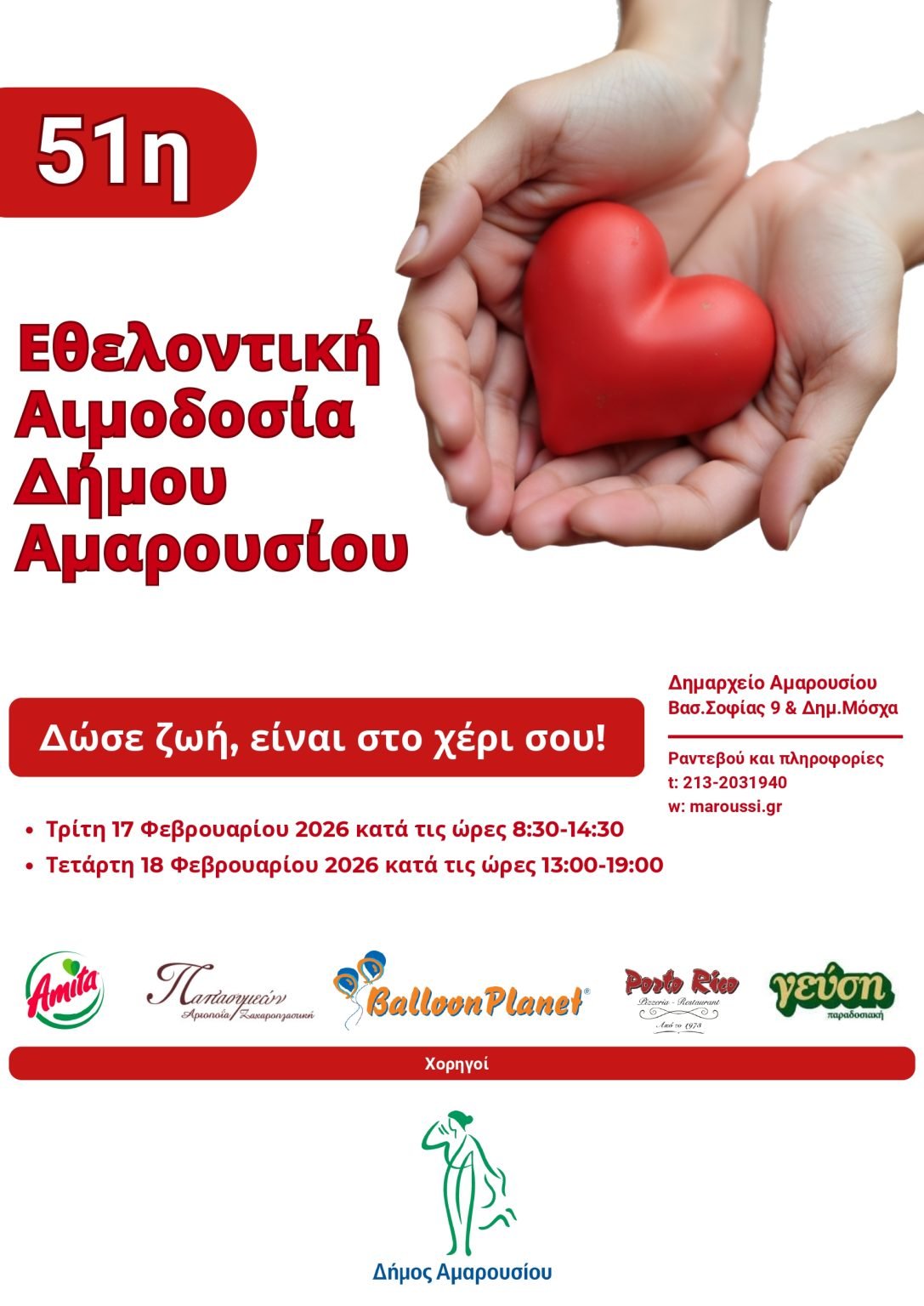 Η Αιμοδοσία θα πραγματοποιηθεί στο Δημαρχείο Αμαρουσίου (Βασ. Σοφίας 9 & Δ. Μόσχα), τις ακόλουθες ημέρες και ώρες: