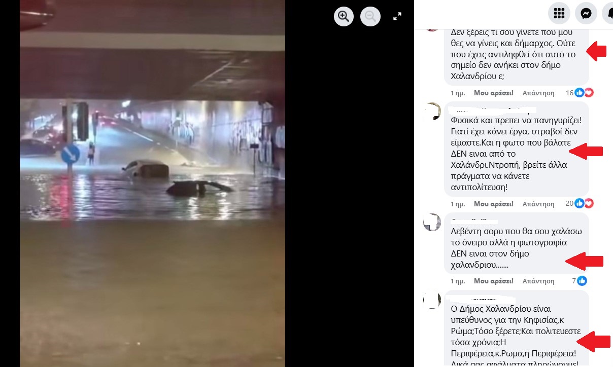 √ Η φωτογραφία, που δεν δίστασε να χρησιμοποιήσει ως απόδειξη πλημμυρικών φαινομένων στο Χαλάνδρι, προέρχεται από την πλημμυρισμένη Σπύρου Λούη, δρόμος που ΔΕΝ ανήκει στα διοικητικά όρια του Δήμου Χαλανδρίου.