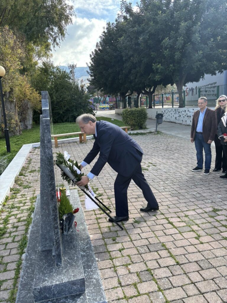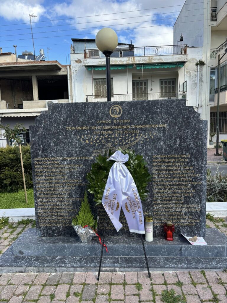 Φόρο τιμής με κατάθεση στεφάνου στο μνημείο των θυμάτων των Τεμπών, στην οδό Ταταούλων, απότισε ο Δήμος Βύρωνα, δια του Δημάρχου Αλέξη Σωτηρόπουλου, χθες Σάββατο, 28 Φεβρουαρίου 2026, ανήμερα της 3ης επετείου του δυστυχήματος.