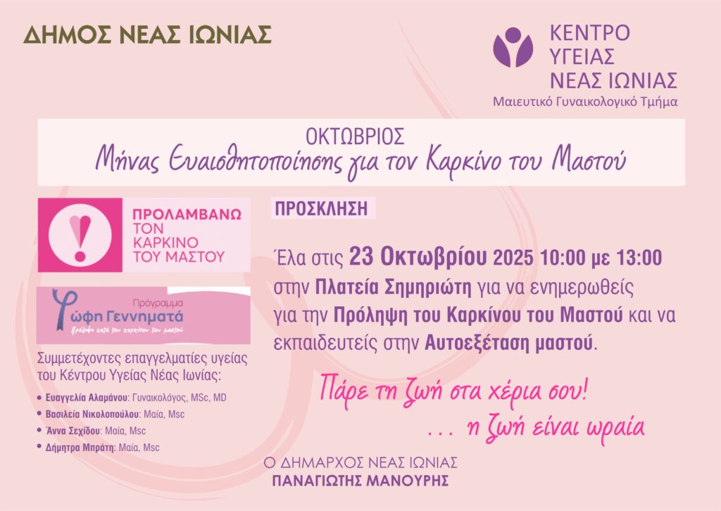 Συγκεκριμένα, από κοινού με το Κέντρο Υγείας Νέας Ιωνίας, διοργανώνουν στις 23 Οκτωβρίου, από τις 10:00 έως τις 13:00, στην πλατεία Σημηριώτη, ενημερωτική δράση για την πρόληψη και την εκπαίδευση στην αυτοεξέταση του μαστού.