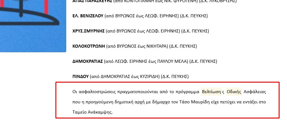 • Ότι το πρόγραμμα με τίτλο “Βελτίωση Οδικής Aσφάλειας” δεν είχε ασφαλτοστρώσεις και πεζοδρόμια αλλά σημάνσεις, διαγραμμίσεις κλπ.