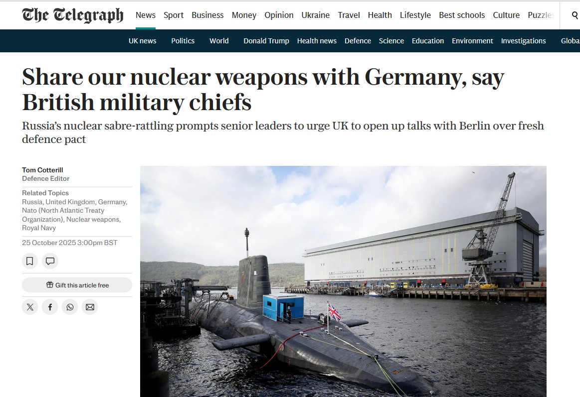 Μωραίνει κύριος… Οι Βρετανοί στρατιωτικοί αρχηγοί υποστηρίζουν τη συμφωνία κοινής χρήσης πυρηνικών όπλων με τη Γερμανία και είναι γνωστό σε όλους η σωφροσύνη της Γερμανίας σε τέτοια ζητήματα!