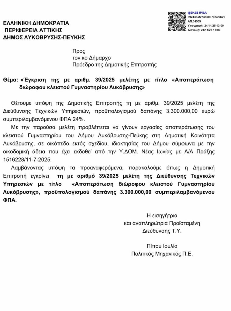 Συγκεκριμένα, ψηφίστηκε στην συνεδρίαση της Δημοτικής Επιτροπής του Δήμου Λυκόβρυσης-Πεύκης η έγκριση της μελέτης για την αποπεράτωση του ημιτελούς κλειστού γυμναστηρίου.