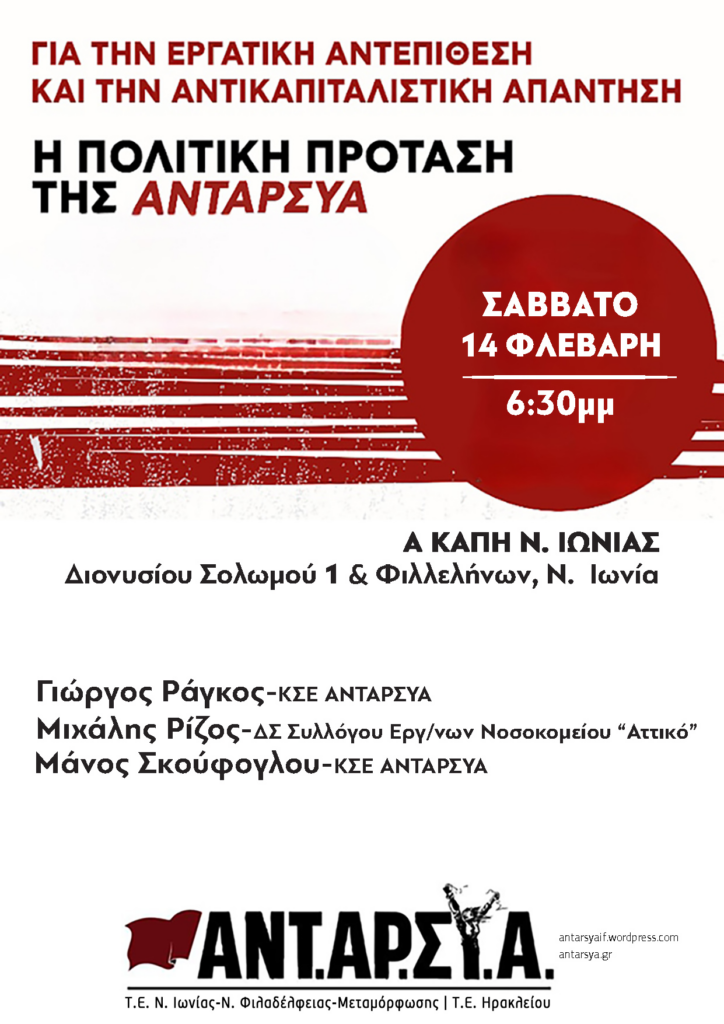 Στο δρόμο για την 6η Συνδιάσκεψη της ΑΝΤΑΡΣΥΑ τον Απρίλιο του ’26, η τοπική επιτροπή Νέας Ιωνίας, Φιλαδέλφειας, Μεταμόρφωση και η τοπική επιτροπή Ηρακλείου Αττικής διοργανώνουν εκδήλωση για την πολιτική πρόταση της ΑΝΤΑΡΣΥΑ το ερχόμενο Σάββατο 14 Φεβρουαρίου.
