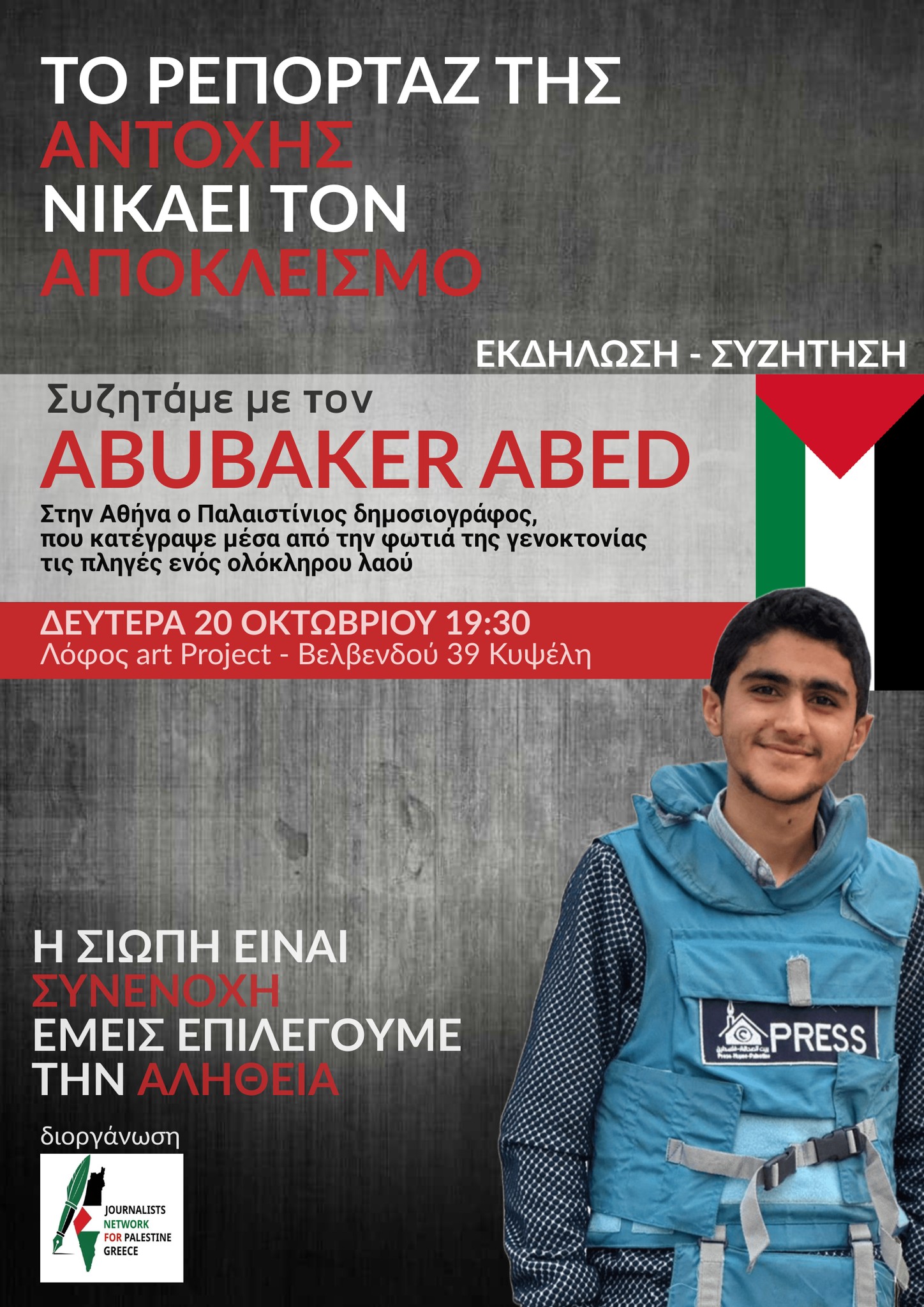 Ένας από τους Παλαιστίνιους δημοσιογράφους που ξέφυγε από την εγκληματική πολεμική μηχανή του Ισραήλ θα βρεθεί στην Αθήνα, σε εκδήλωση του Δικτύου Δημοσιογράφων για την Παλαιστίνη