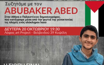 Ένας από τους Παλαιστίνιους δημοσιογράφους που ξέφυγε από την εγκληματική πολεμική μηχανή του Ισραήλ θα βρεθεί στην Αθήνα, σε εκδήλωση του Δικτύου Δημοσιογράφων για την Παλαιστίνη Πρόκειται για τον Abubaker Abed, ο οποίος είναι ένας από τους νεότερους Παλαιστίνιους δημοσιογράφους που, μέσα σε συνθήκες απόλυτης καταστροφής, κατέγραψε τα εγκλήματα του Ισραήλ στην Παλαιστίνη. Σε ηλικία … Συνεχίστε να διαβάζετε το Εκδήλωση με Παλαιστίνιο δημοσιογράφο που δεν δολοφόνησε το Ισραήλ.