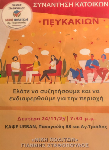Εν όψει του Προϋπολογισμού έτους 2026 του Δήμου Αγίας Παρασκευής, καλούμε σε συνάντηση – συζήτηση τους κατοίκους της περιοχής Πευκακίων την Δευτέρα 24 Νοεμβρίου, στις 7.30′ μ.μ. στο καφέ Urban, γωνίας των οδών Παναγούλη 88 και Αγ. Τριάδος.