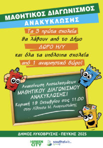 Ανακοινώνονται αυτή την Κυριακή, 19 Οκτωβρίου 2025, τα αποτελέσματα του Μαθητικού Διαγωνισμού Ανακύκλωσης του Δήμου Λυκόβρυσης – Πεύκης. Η εκδήλωση ανακοίνωσης και βράβευσης των συμμετεχόντων
