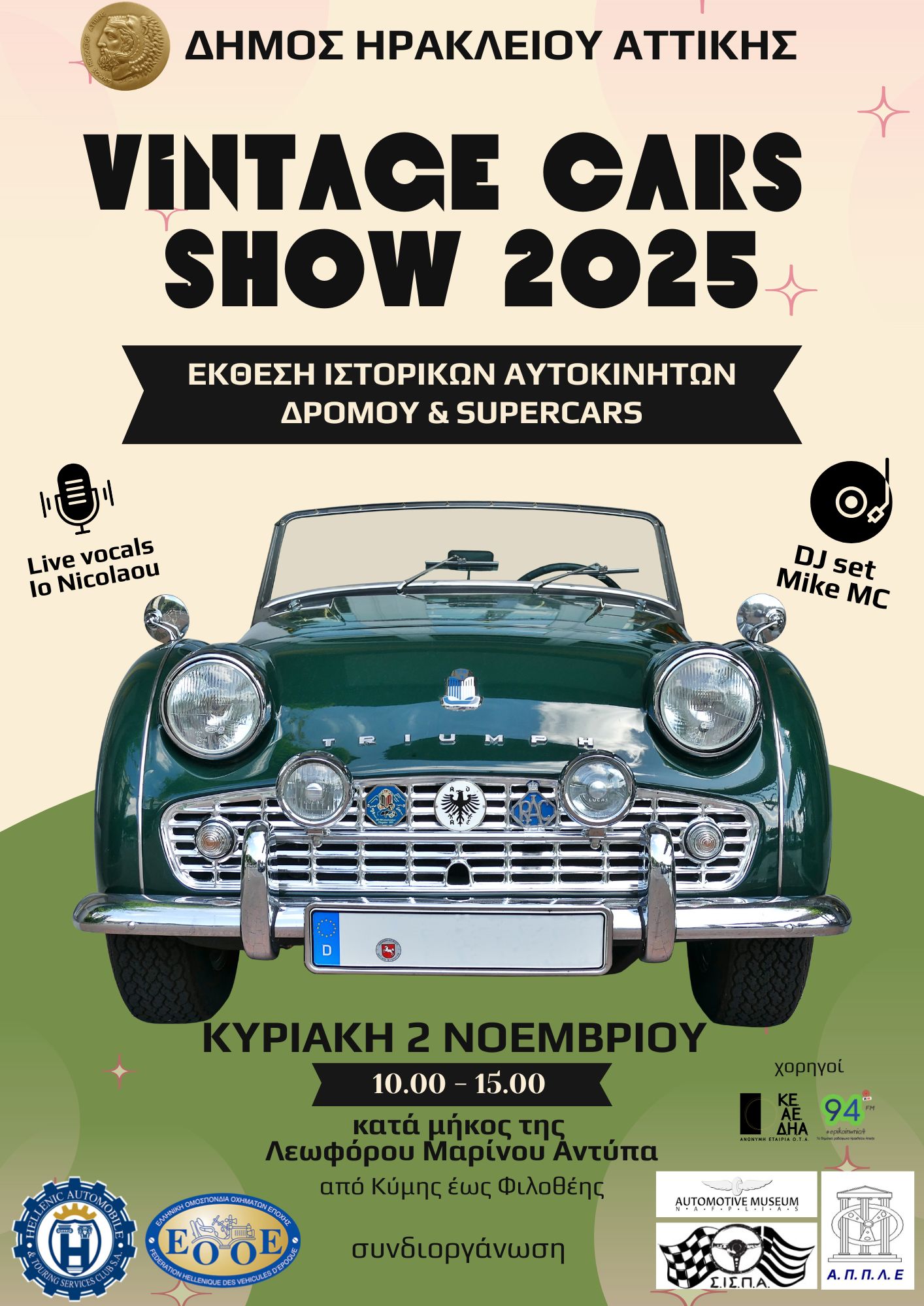 Έκθεση ιστορικών και κλασσικών αυτοκινήτων πραγματοποιείται στον Δήμο Ηρακλείου Αττικής την Κυριακή, 2 Νοεμβρίου 2025, στη λεωφόρο Μαρίνου Αντύπα (από Κύμης έως Φιλοθέης) και κατά τις ώρες 10.00′ – 15.00′.