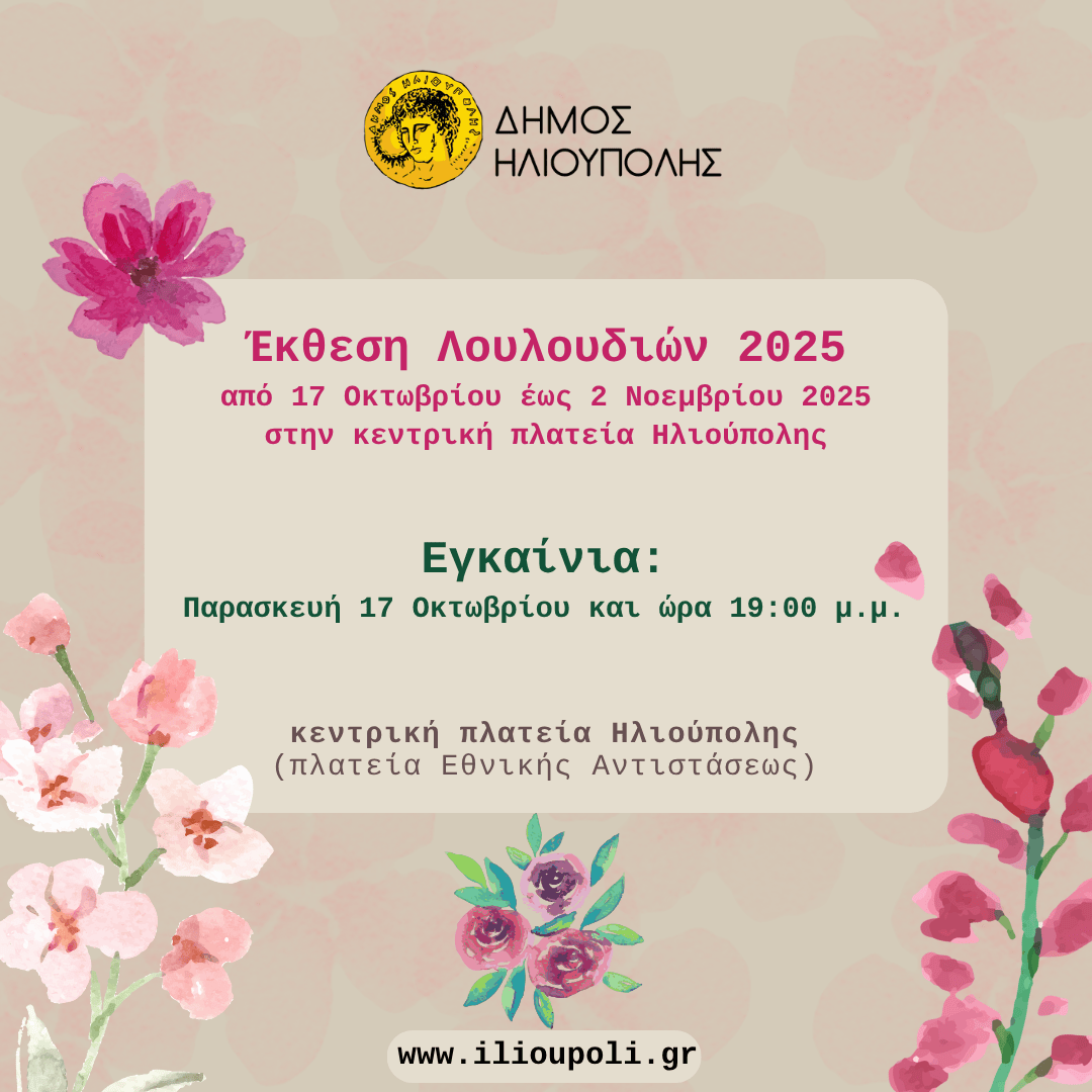 Από την Παρασκευή 17 Οκτωβρίου έως την Κυριακή 2 Νοεμβρίου 2025 η έκθεση λουλουδιών της Ηλιούπολης, στην κεντρική πλατεία της πόλης.