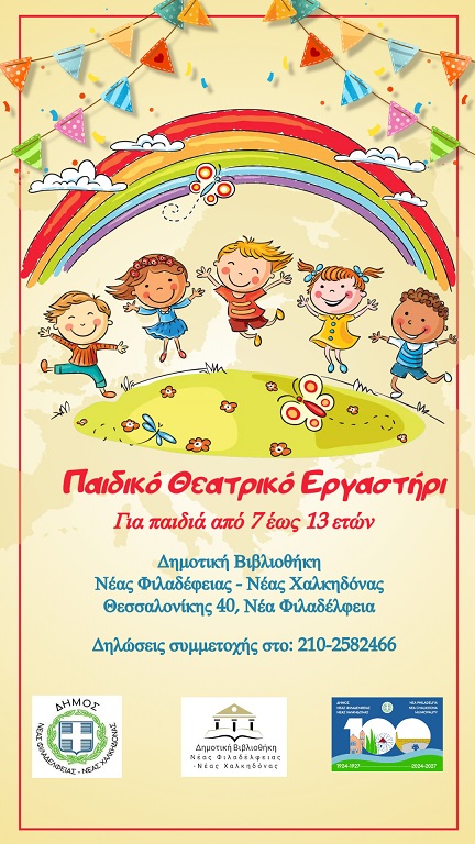 Το Παιδικό Θεατρικό Εργαστήρι έχει ανοίξει τις πύλες του και περιμένει τους μικρούς του φίλους, ηλικίας 7 έως 13 ετών, για να ζήσουμε στιγμές γεμάτες παραμύθι, θεατρικό παιχνίδι, χορό, τραγούδι και άλλες ευχάριστες δράσεις. Στοχεύει σε θεατρικές παραστάσεις των παραμυθιών της Παιδαγωγού πρώιμης παιδικής ηλικίας κυρίας Ιουλίας Τσυλικοχρύσου.