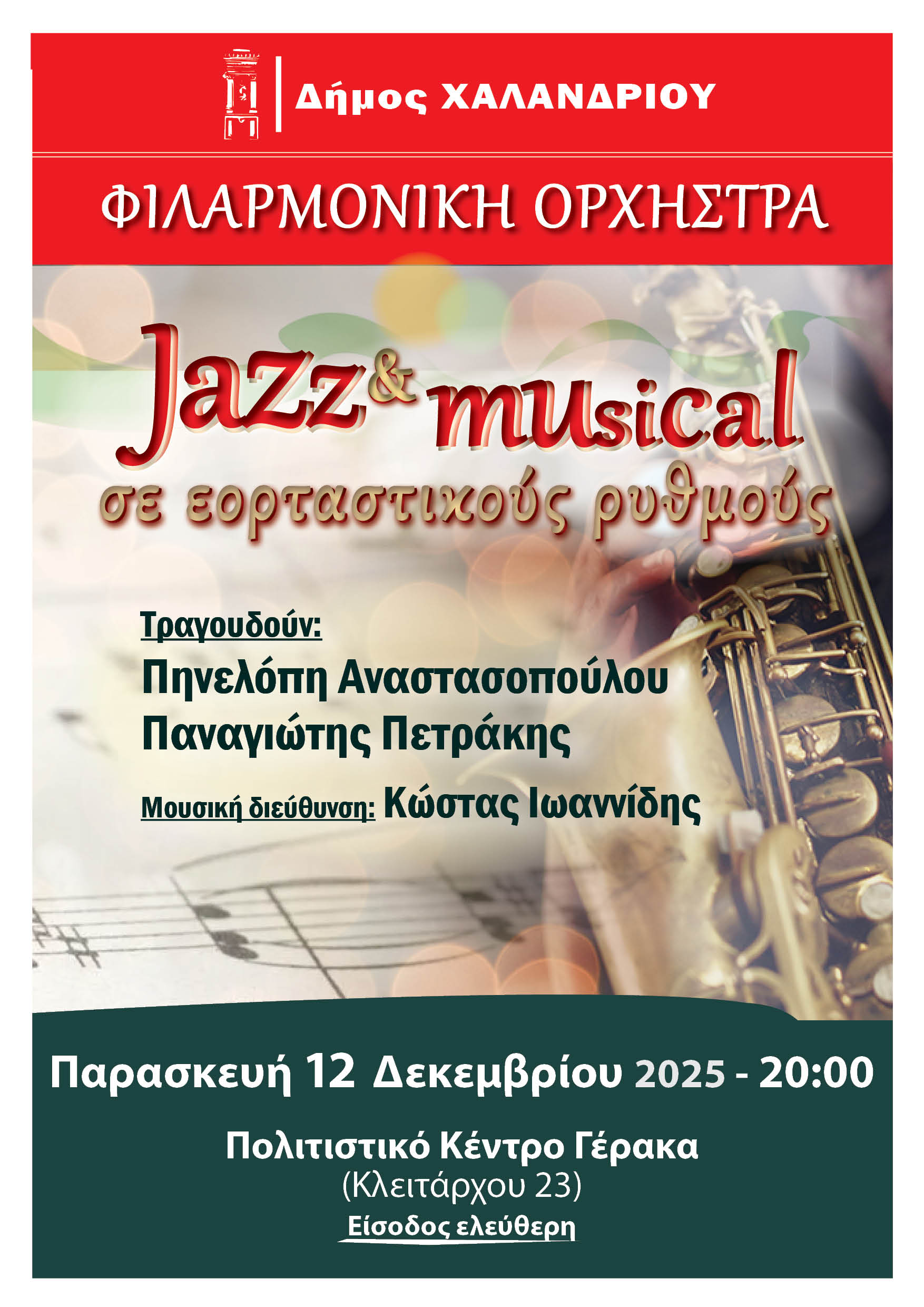 Εορταστική Συναυλία πραγματοποιείται την Παρασκευή 12 Δεκεμβρίου 2025 από την Φιλαρμονική Ορχήστρα Χαλανδρίου. Η συναυλία με τίτλο “Jazz, musical σε εορταστικούς ρυθμούς” θα λάβει χώρα στο Πολιτιστικό Κέντρο Γέρακα (Κλειτάρχου 23), στις 8.00′ μ.μ. και σε αυτήν θα συμμετέχουν επίσης οι καλλιτέχνες Πηνελόπη Αναστασοπούλου και Παναγιώτης Πετράκης.