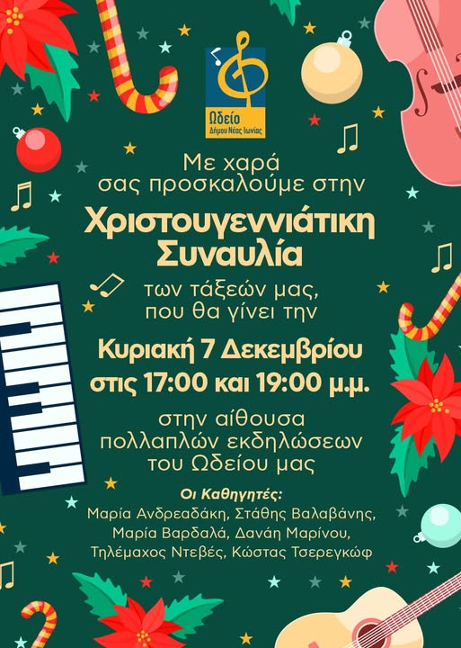 Την Κυριακή 7 Δεκεμβρίου στις 5:00 και 7:00 μμ το Δημοτικό Ωδείο Νέας Ιωνίας διοργανώνει Χριστουγεννιάτικη Συναυλία με σπουδαστές των τάξεών του.