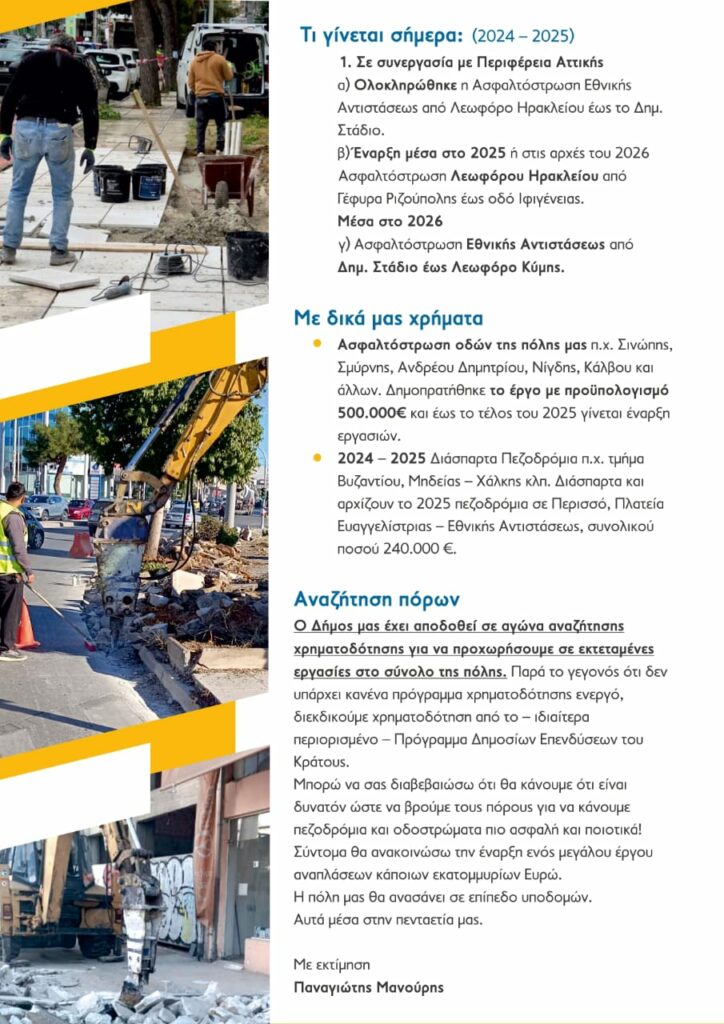 με αυτήν την επιστολή θέλω να σας ενημερώσω για την κατάσταση που βρίσκεται ο Δήμος μας σε σχέση με τα πεζοδρόμια και τα οδοστρώματα, τις χρηματοδοτήσεις που χάθηκαν αλλά φυσικά το τι πρόκειται να πράξουμε εμείς ως Δημοτική Αρχή.