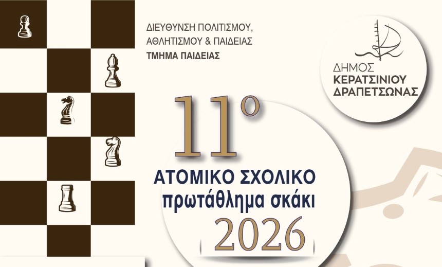Έρχεται το Σάββατο 25 Απριλίου 2026 το 11ο Σχολικό Πρωτάθλημα Σκάκι Δήμου Κερατσινίου-Δραπετσώνας 2026 που διοργανώνει ο Δήμος Κερατσινίου – Δραπετσώνας σε συνεργασία με το 3ο ΓΕΛ Κερατσινίου και τη Σκακιστική Ένωση Κερατσινίου – Δραπετσώνας “Οι Μαχητές“. Οι αγώνες ξεκινούν στις 10.00′ π.μ., η συμμετοχή είναι δωρεάν και οι ενδιαφερόμενοι θα πρέπει να έχουν προβεί σε επιβεβαίωση της συμμετοχής τους μέχρι τις 9.30′ π.μ.