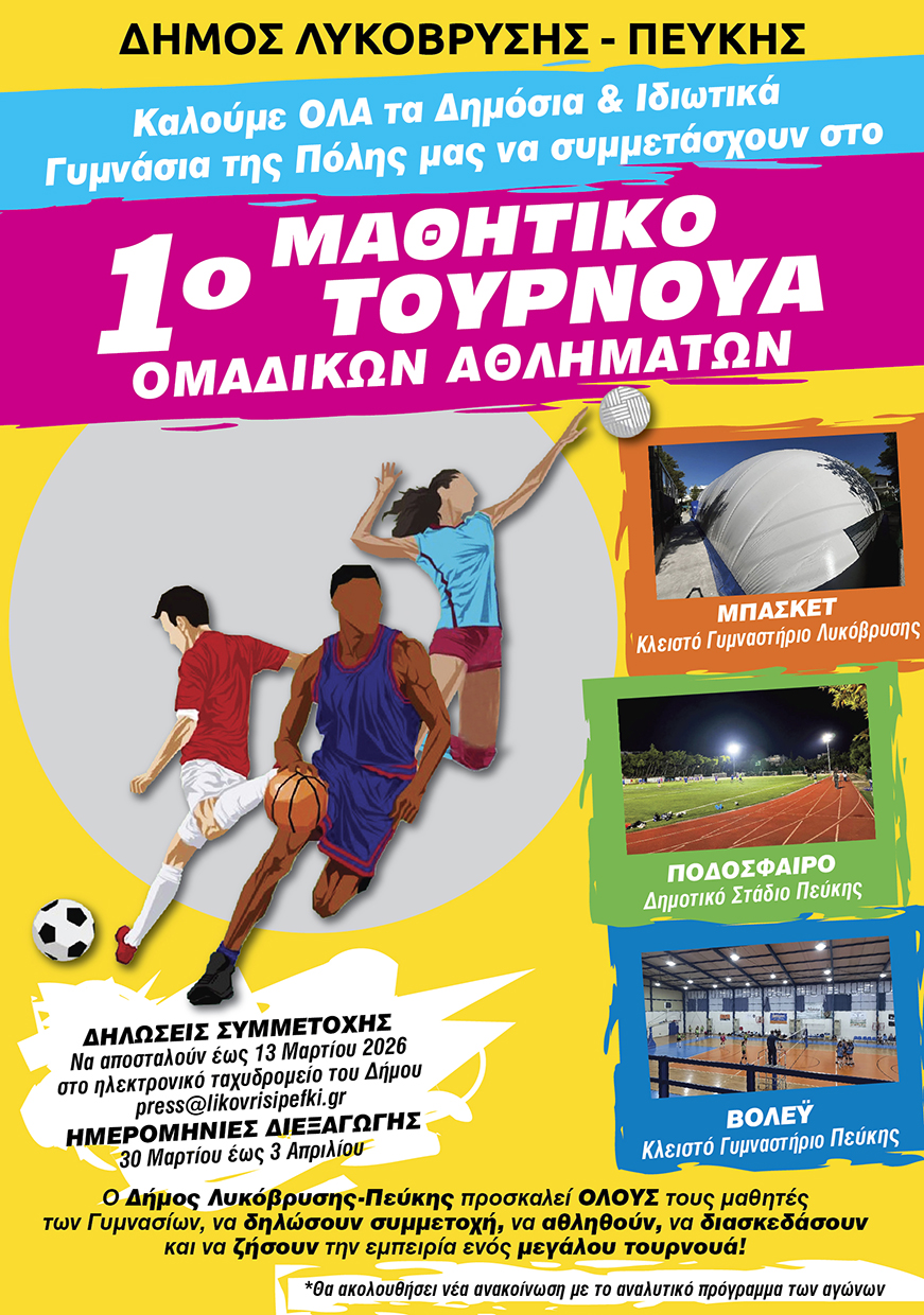 Έρχεται το 1ο Μαθητικό Τουρνουά Ομαδικών Αθλημάτων του Δήμου Λυκόβρυσης – Πεύκης. Το τουρνουά αφορά το Μπάσκετ, το Ποδόσφαιρο και το Βόλεϊ και η υπηρεσία Αθλητισμού και Πολιτισμού του Δήμου καλεί όλα τα σχολεία, δημόσια και ιδιωτικά, σε συμμετοχή. Οι αγώνες θα πραγματοποιηθούν την εβδομάδα: 30 Μαρτίου – 3 Απριλίου 2026, ενώ οι δηλώσεις συμμετοχής γίνονται δεκτές μέχρι και τις 13 Μαρτίου.