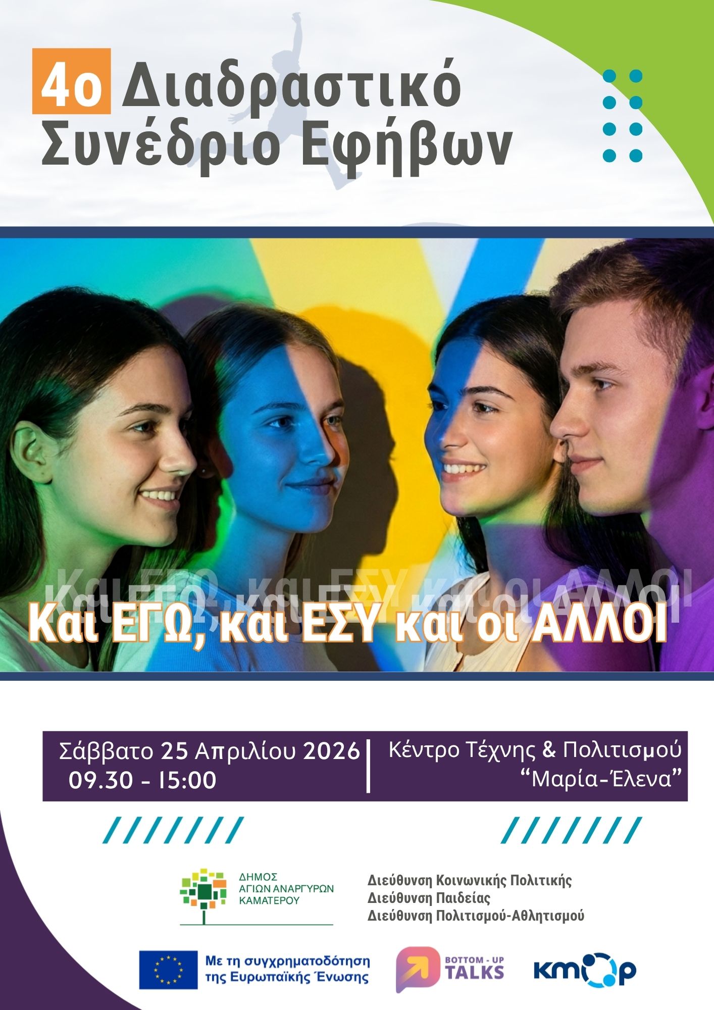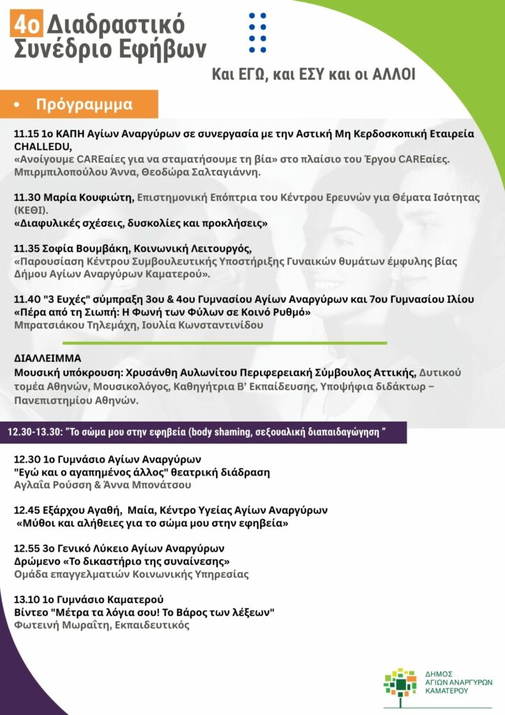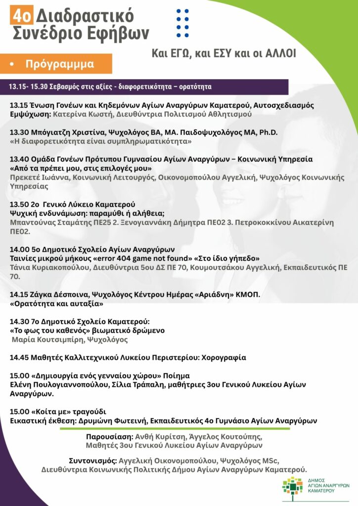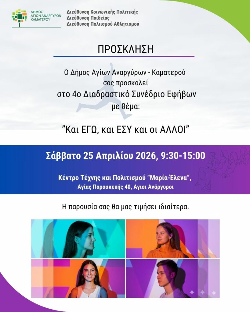 Έρχεται το 4ο Διαδραστικό Μαθητικό Συνέδριο που πραγματοποιείται υπό την αιγίδα των υπηρεσιών Κοινωνικής Πολιτικής, Υγείας και Πολιτισμού και Αθλητισμού του Δήμου Αγίων Αναργύρων – Καματερού. Η εκδήλωση θα λάβει χώρα το Σάββατο 25 Απριλίου 2026, από τις 9.30′ π.μ. έως τις 3.00′ μ.μ. στο Κέντρο Τέχνης και Πολιτισμού “Μαρία – Έλενα” του Δήμου Αγίων Αναργύρων – Καματερού.